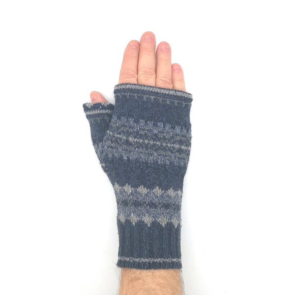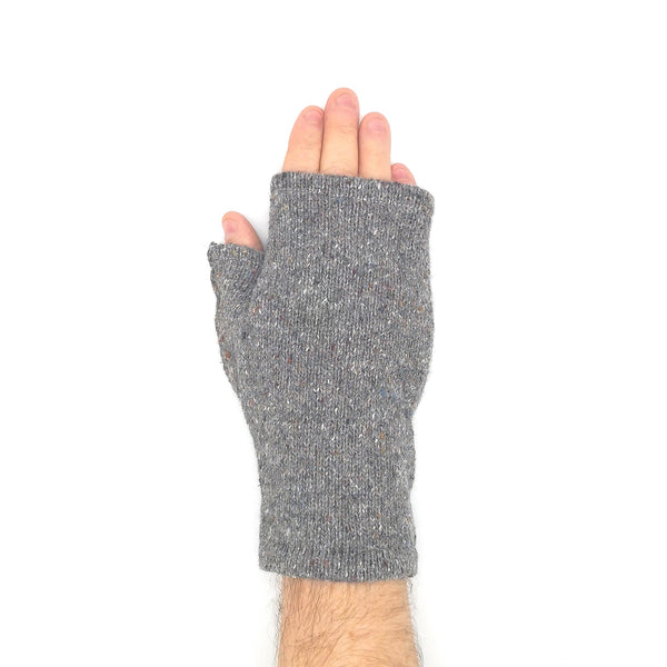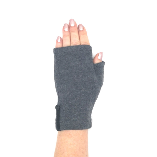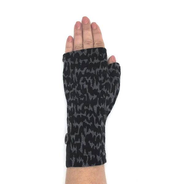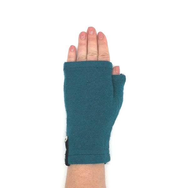 Two people's hands wearing fingerless gloves handmade by Kitten Mittens